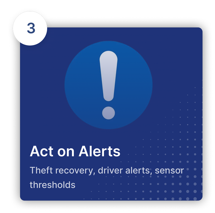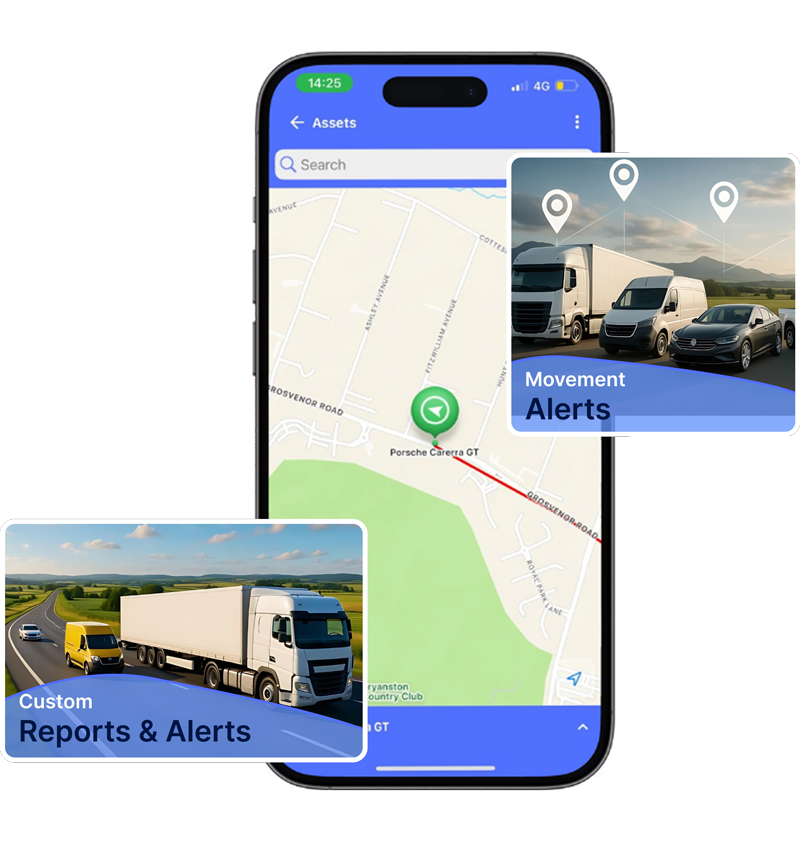 Sends alerts for events like speeding, unauthorized movement, geofence breaches, or engine on/off status